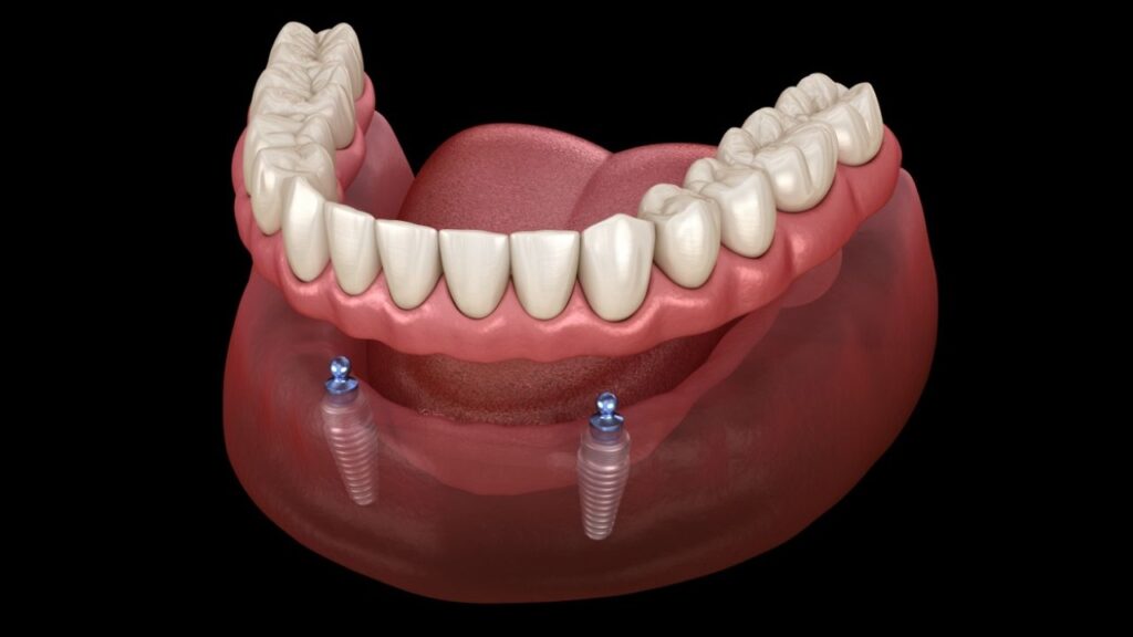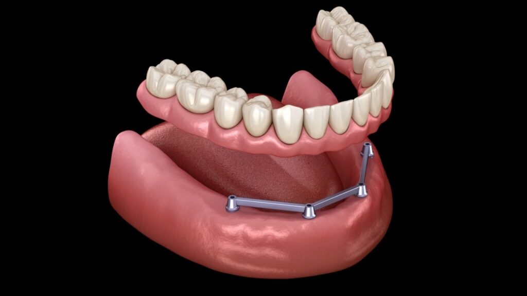 Overdenture, Dentadura Grampeada ou Sobredentadura, nada mais é do que uma Dentadura convencional (Removível) grampeada à implantes. Essa modalidade de prótese pode ser utilizada como temporária, provisoriamente, ou mesmo definitiva. Usualmente requerem menor quantidade de Implantes: Inferior 2 e superior 2 a 4 . Existem vários sistemas de grampeamento:  Ouring; Barra clip e até sistemas imantados. Cabendo ao Implantodontista a melhor escolha.